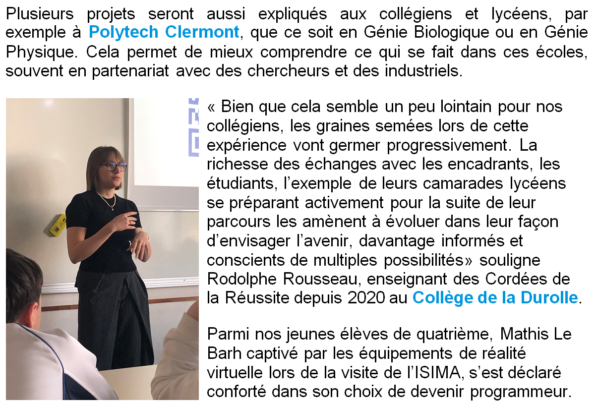 Le 27 février, les Graines d’Ingénieurs du Collège de la Durolle et du Lycée Jean Zay ont bénéficié d’une visite VIP à Clermont Auvergne INP, tête de notre Cordée de la Réussite.